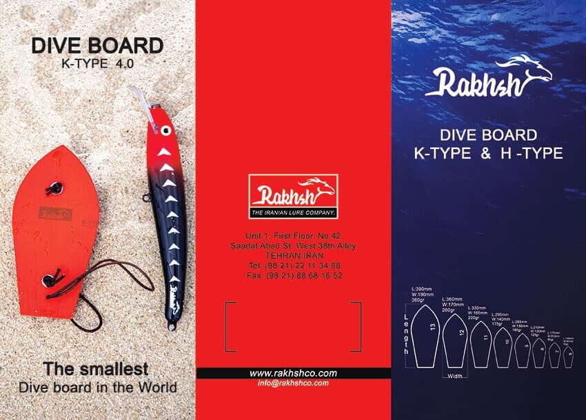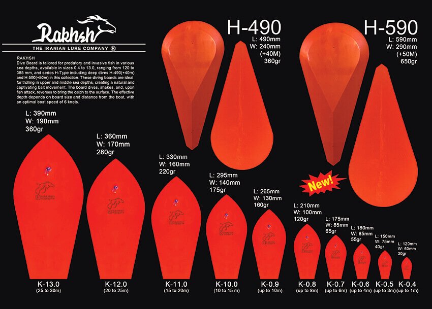Rakhsh Inc’s K-type dive board is available in diverse sizes from 4 to 13, facilitating fishing from very shallow depths of 1 meter down to an impressive 30 meters. This broad range of operational depths signifies the high adaptability of this Rakhsh Inc product, allowing anglers to target various fish species in different habitats.