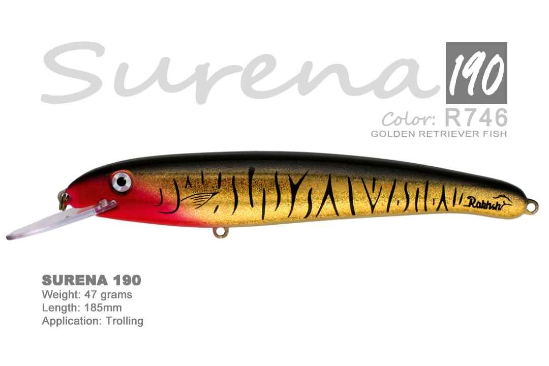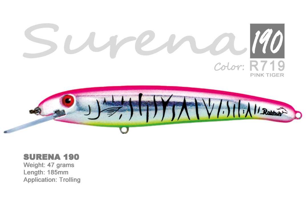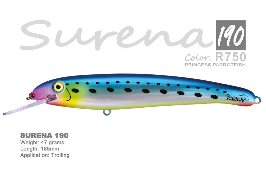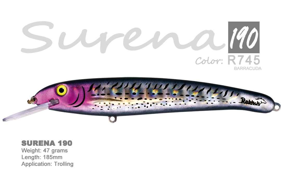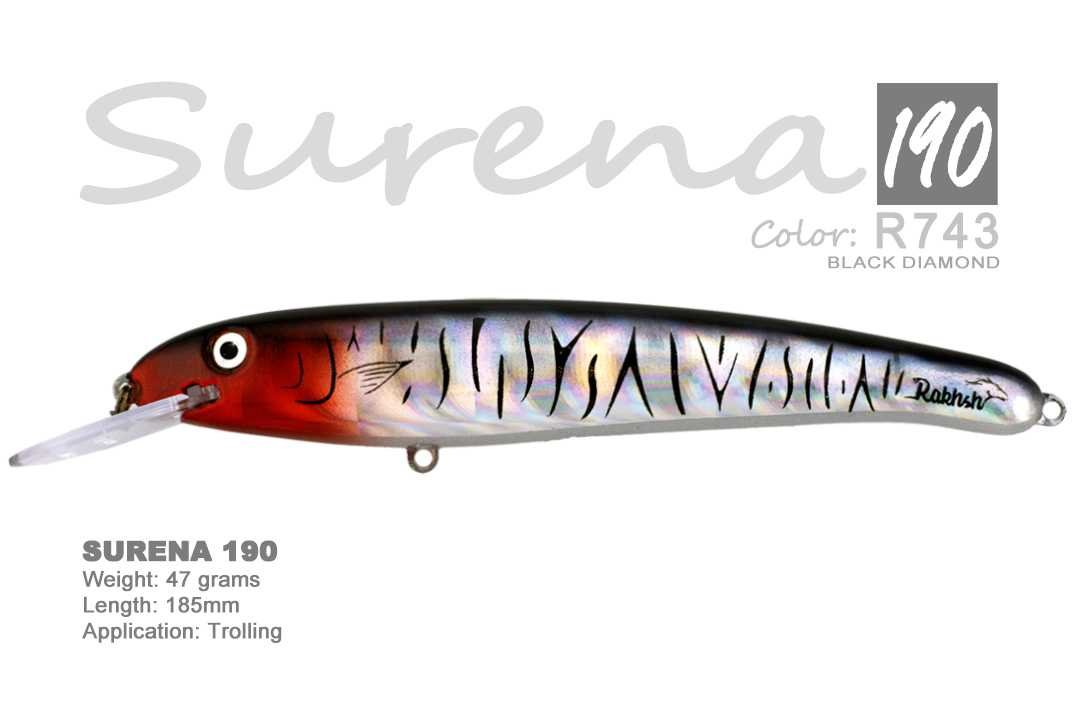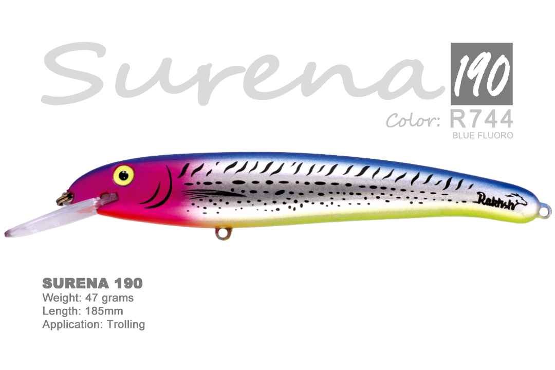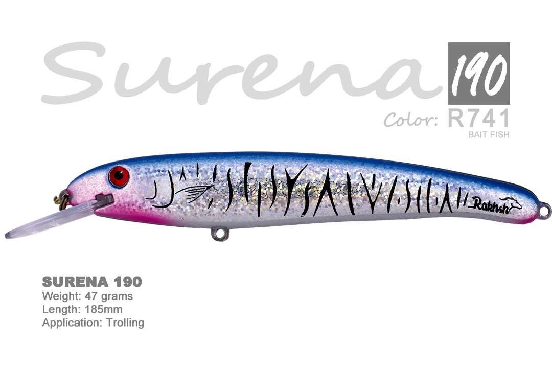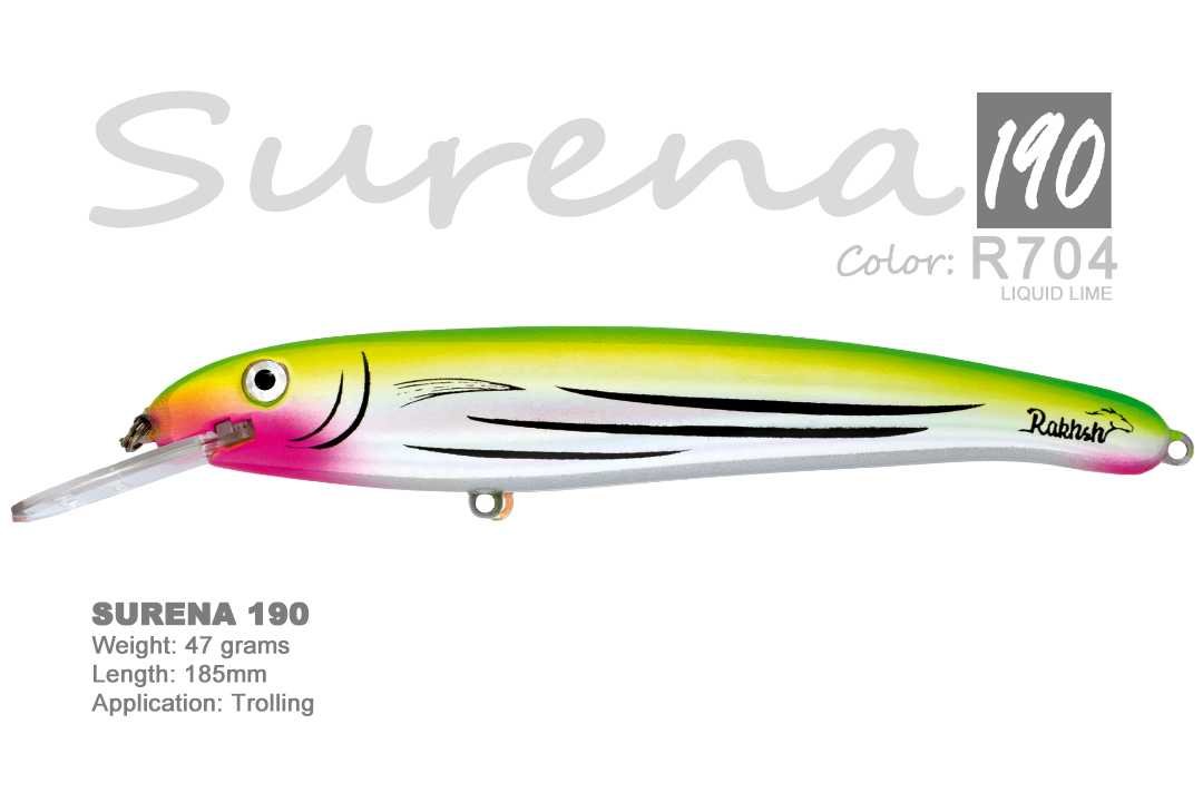 The SURENA 190 is a high-tech fishing lure, suitable for various fish from Bluewater to Barramundi, designed for strength, durability, and effective fish-catching. It offers diverse diving depths (1-7 meters) and features robust, integrated hook anchoring and towing points. Halco’s “Bulletproof” bib system ensures reliable performance across all speeds. Recognized as a top Bluewater trolling lure, it performs best for pelagiids around 6.5 knots, and should be trolled 10 to 50 meters from the boat.SURENA 190